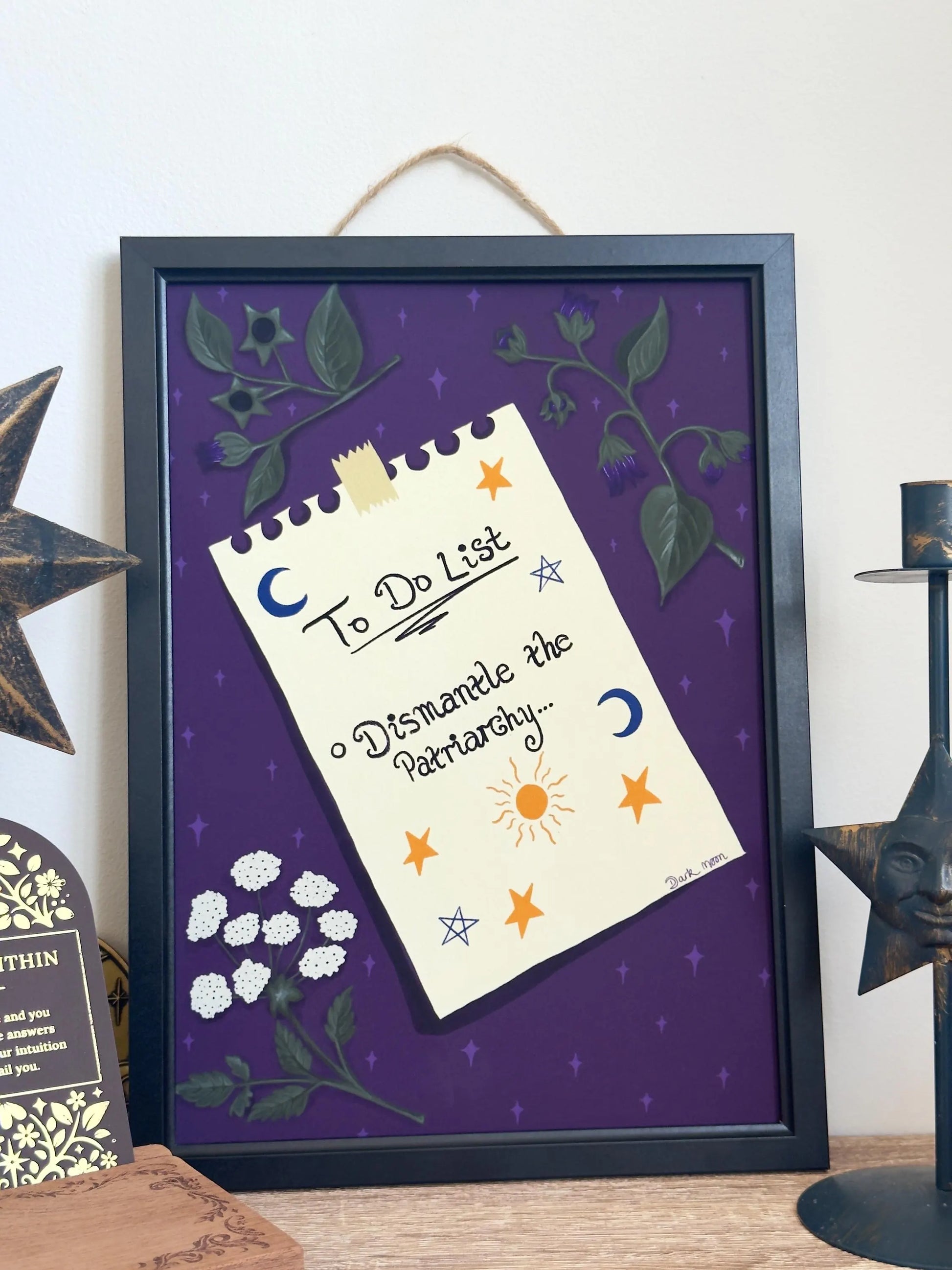 Mystical witchy print of a to do list surrounded by poisonous plants and stars, with the typography “To do list: Dismantle the Patriarchy” 🔮☠️⭐️